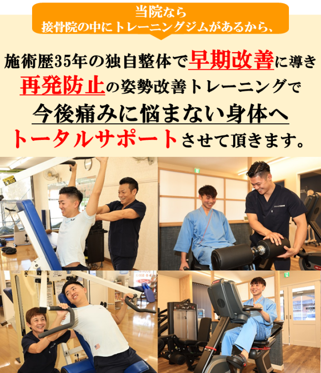 昔から猫背と反り腰がすごく気になっていてこれまでいろいろな治療院に通っていました。ですがなかなか根本改善せずネットでトレーニングをするといいと見たので調べていたところトレーニングジムが併設している接骨院ということで来院しました。